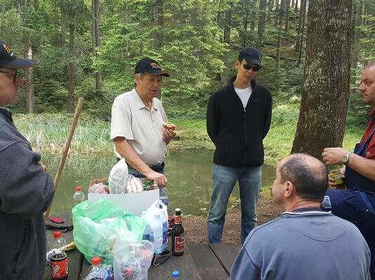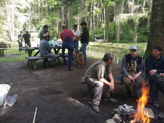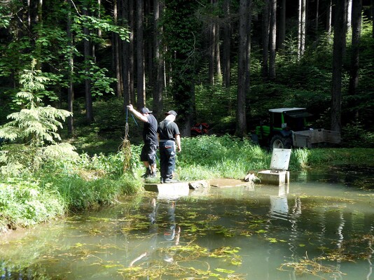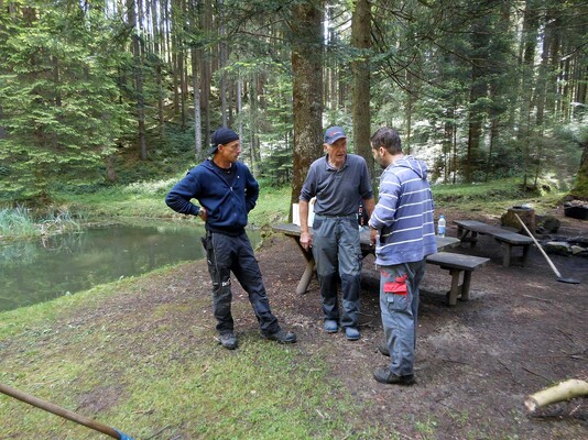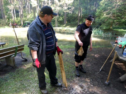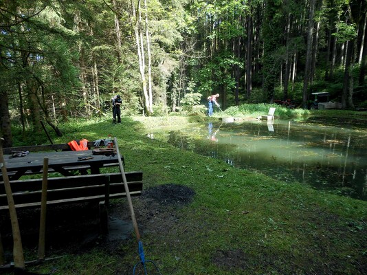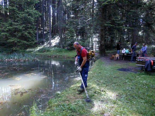 „Team Weiher“ mähte rundherum aus, entfernte Schlingpflanzen, treibendes Material von der Wasseroberfläche, säuberte den kompletten Platz von Scherben, Dosen oder anderen unliebsamen Materialen, reparierte die von Vandalen ausgerissene Bank, stappelte herumliegendes Holz bei der Weiher-Lagerstätte, kontrollierte und säuberte den Teich-Mönch bzw. den Abfluss und kümmerte sich nicht zuletzt um die Feuerstelle, dass diese wieder aufgeräumt und mit Steinen neu umfasst wurde.