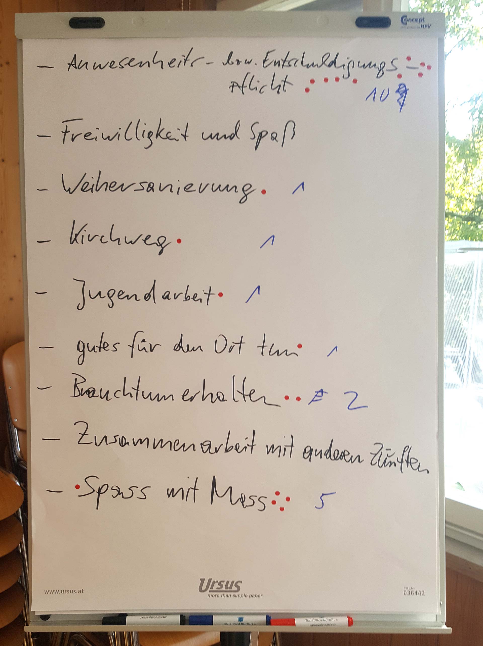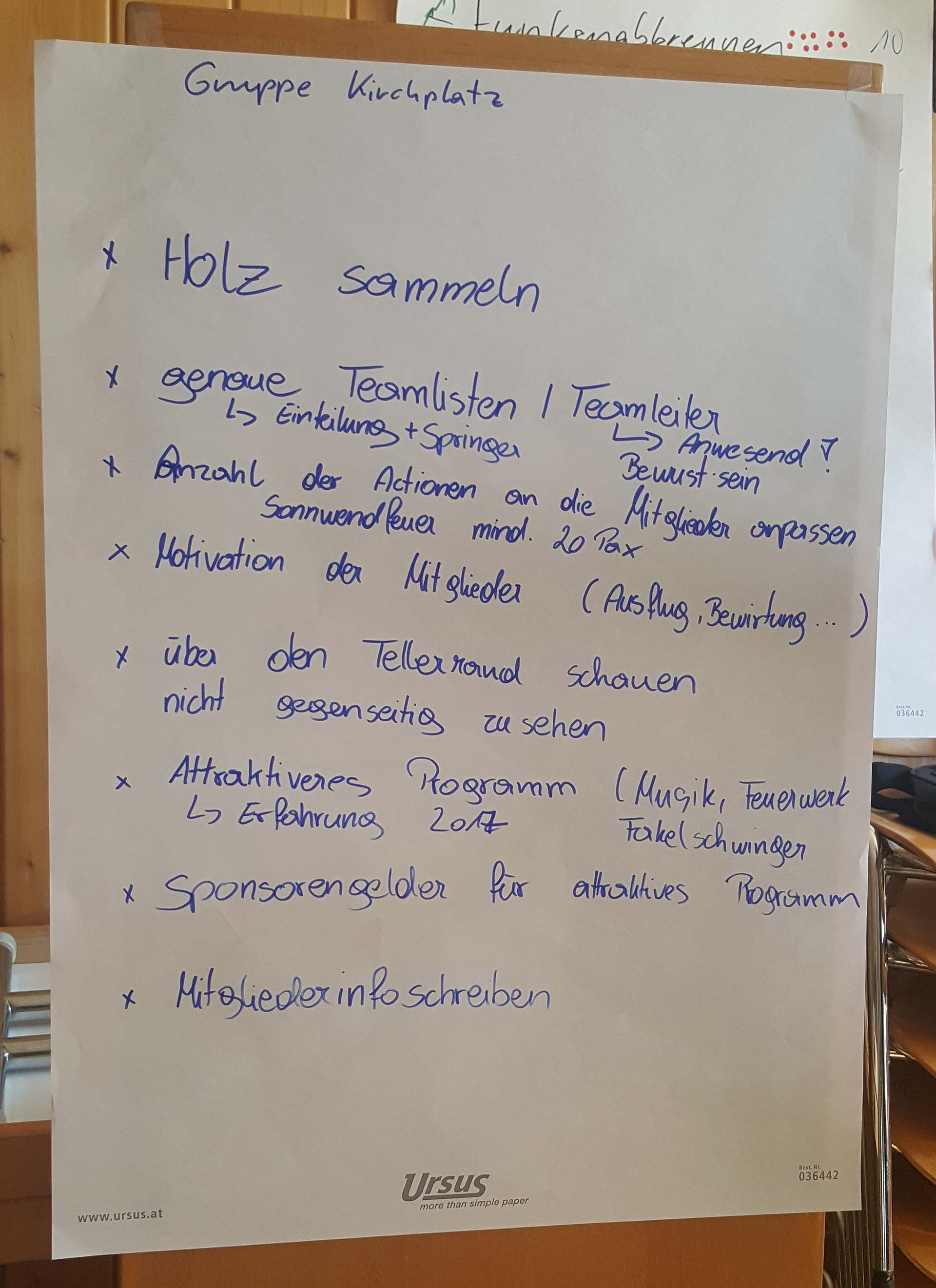Unter der Leitung von Manfred Knecht trafen sich 15 Mitglieder, um gemeinsam über die Interessen und Aufgaben des Vereins, der Vereinsmitglieder und des Vorstand zu diskutieren. In einem sehr produktiven Vormittag. wurden die wichtigsten Aufgaben des Verein fokussiert und thematisiert. Gleichzeit versuchten die Mitglieder in 2 Gruppen anhand des Funkens bzw. des Sonnwendfeuers Ideen zu erarbeiten um den Ablauf bzw. die Organisation zu verbessern.