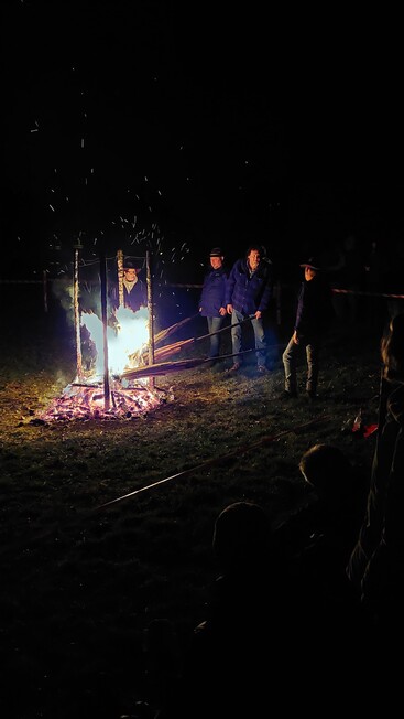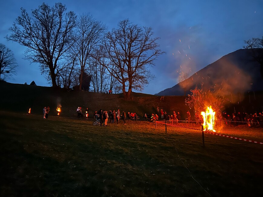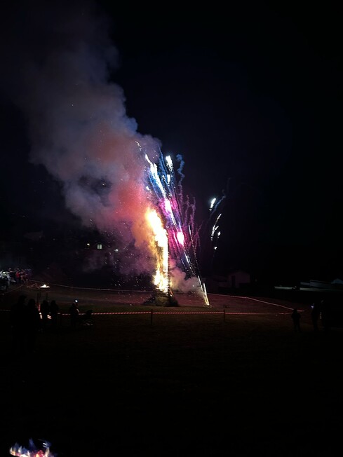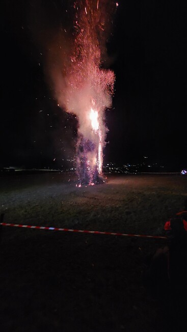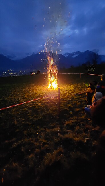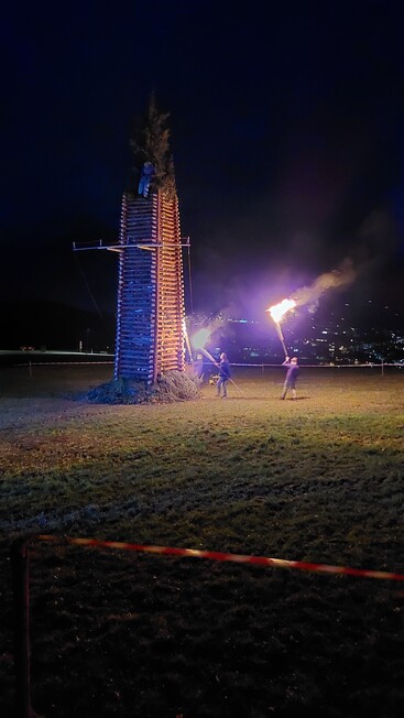 Um 18 Uhr schritten in einem großen Fackelzug weit über 30 Kinder mit ihren Eltern und Jürgen Sonderegger vom alten Feuerwehrhaus zum Funkenplatz. Nach eine kurzen Festrede von Vize-Obmann Klaus Tschabrunn zündete Funkenmeister Gerold Stark zusammen mit der Funkengotta Brigitte zuerst den Kinderfunken und anschließend den großen Funken an. Ein kleines aber feines Feuerwerk sorgte für strahlende Augen im Publikum. Danke an unseren Pyrotechniker Mathias Hoch. Die beiden Hexen *Pandora & Papyra* übernahmen wie jedes Jahr - die Sorgen und Ängste der Leute.